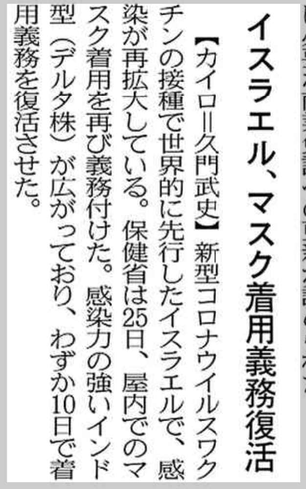 世界で最もワクチン接種がすすんでいると言われているイスラエルにおいては、6月15日からマスクの着用義務が解除されていました。しかしデルタ株の急増により6月25日より再度マスクの着用義務が復活することになりました。アメリカでも一部の州ではマスク着用が復活したとの報道もあります。
